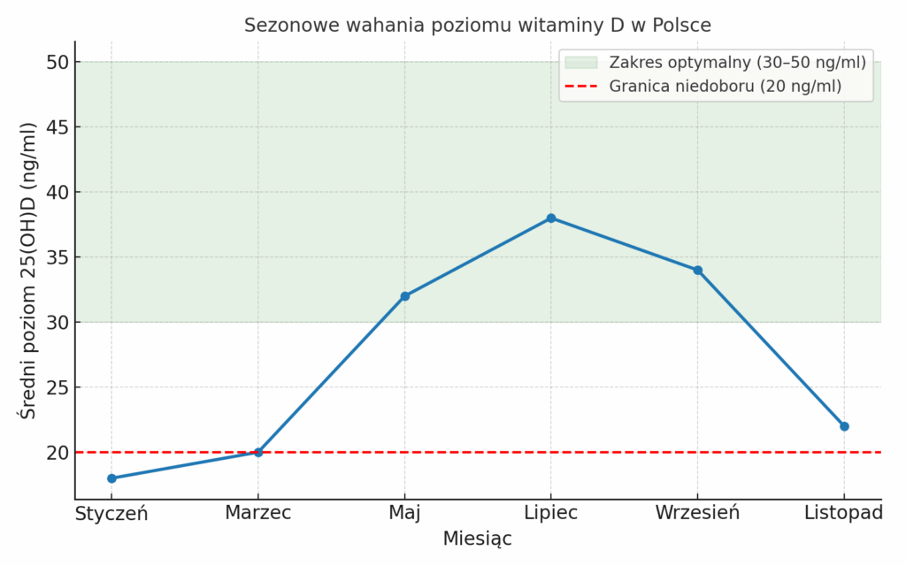 Rycina 1. Sezonowe zmiany orientacyjnego poziomu 25(OH)D w Polsce: latem wartości zwykle mieszczą się w zakresie optymalnym, natomiast zimą częściej spadają w okolice niedoboru, co uzasadnia suplementację w sezonie chłodnym.